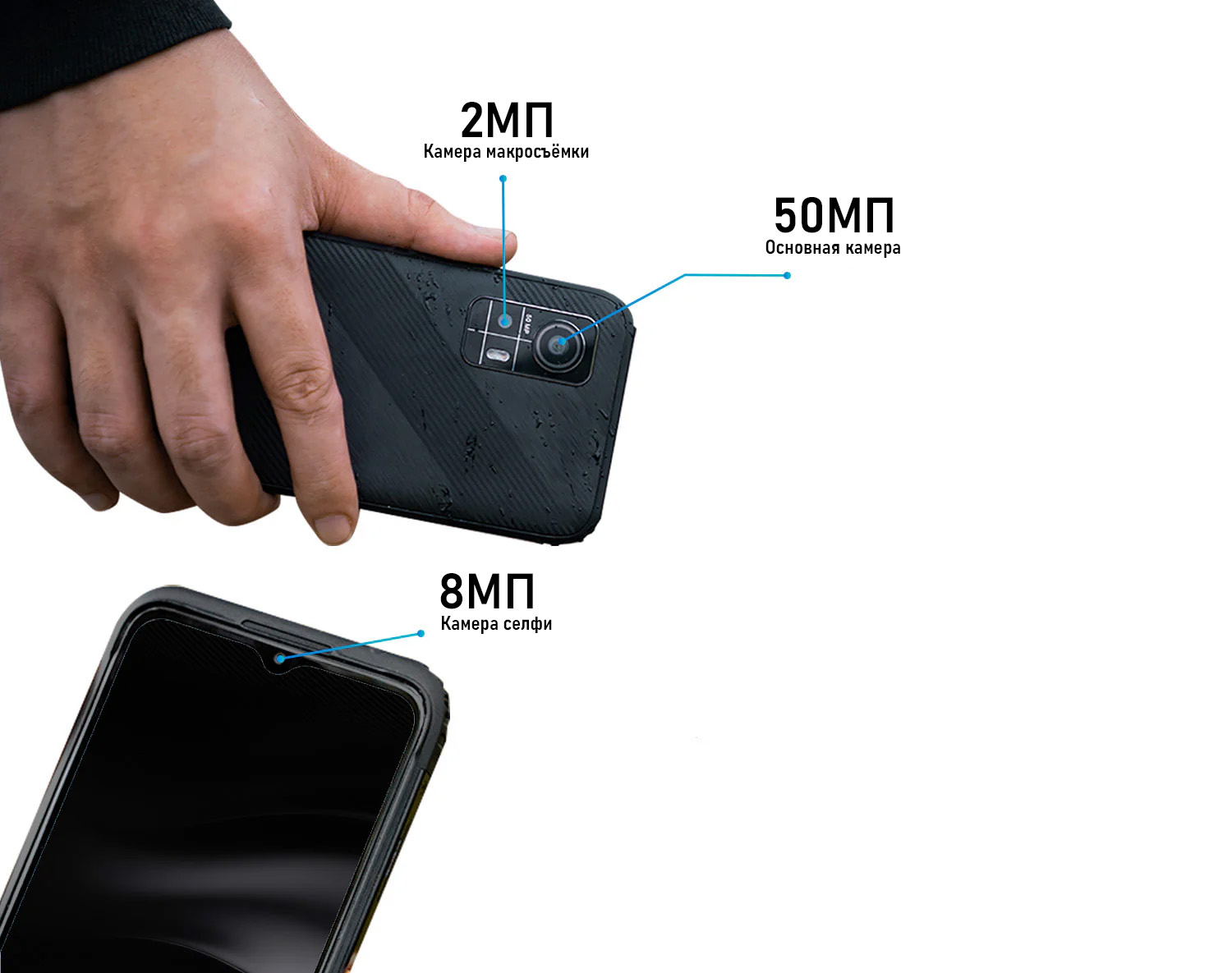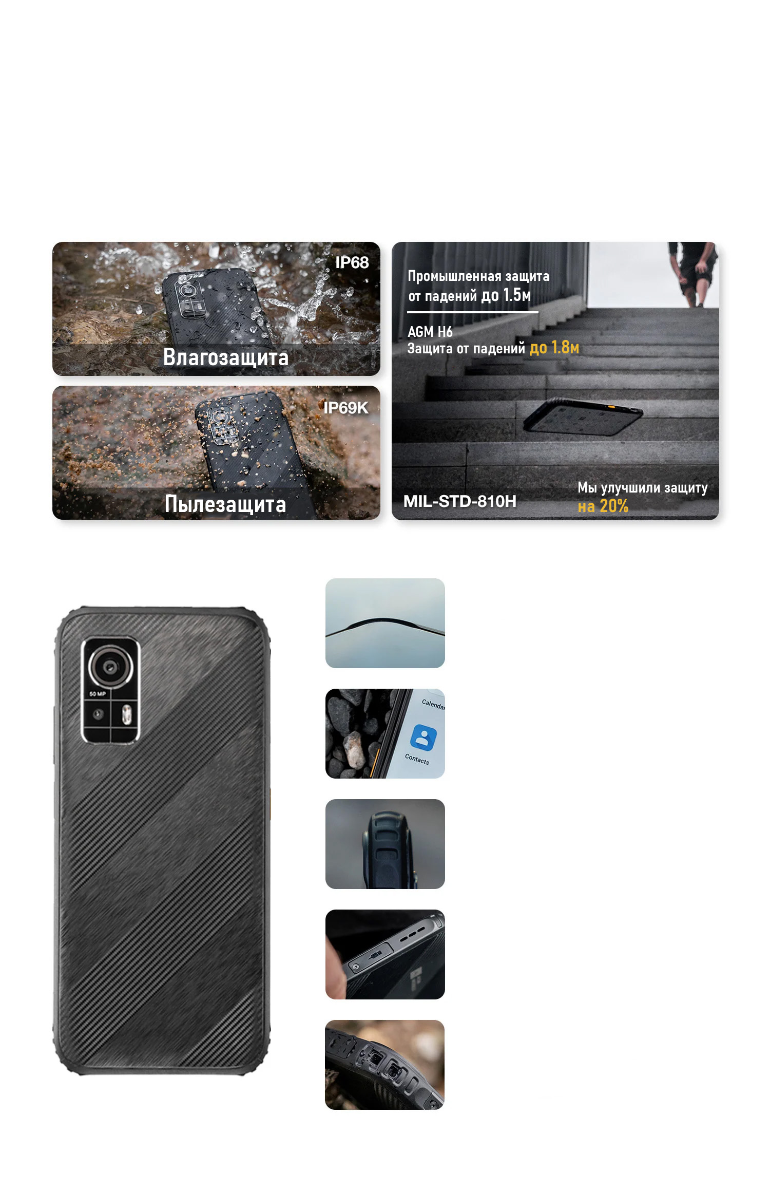 "Современные защищённые смартфоны зачастую слишком большие, толстые или тяжёлые, непрактичные. Наши исследования показывают, что 63% потребителей отказываются от своих защищённых телефонов из-за неприемлемых габаритов. Поэтому представляем Вам AGM H6: компактный защищённый смартфон на каждый день. Поместится в карман узких джинс, отлично подходит для ежедневного использования.
