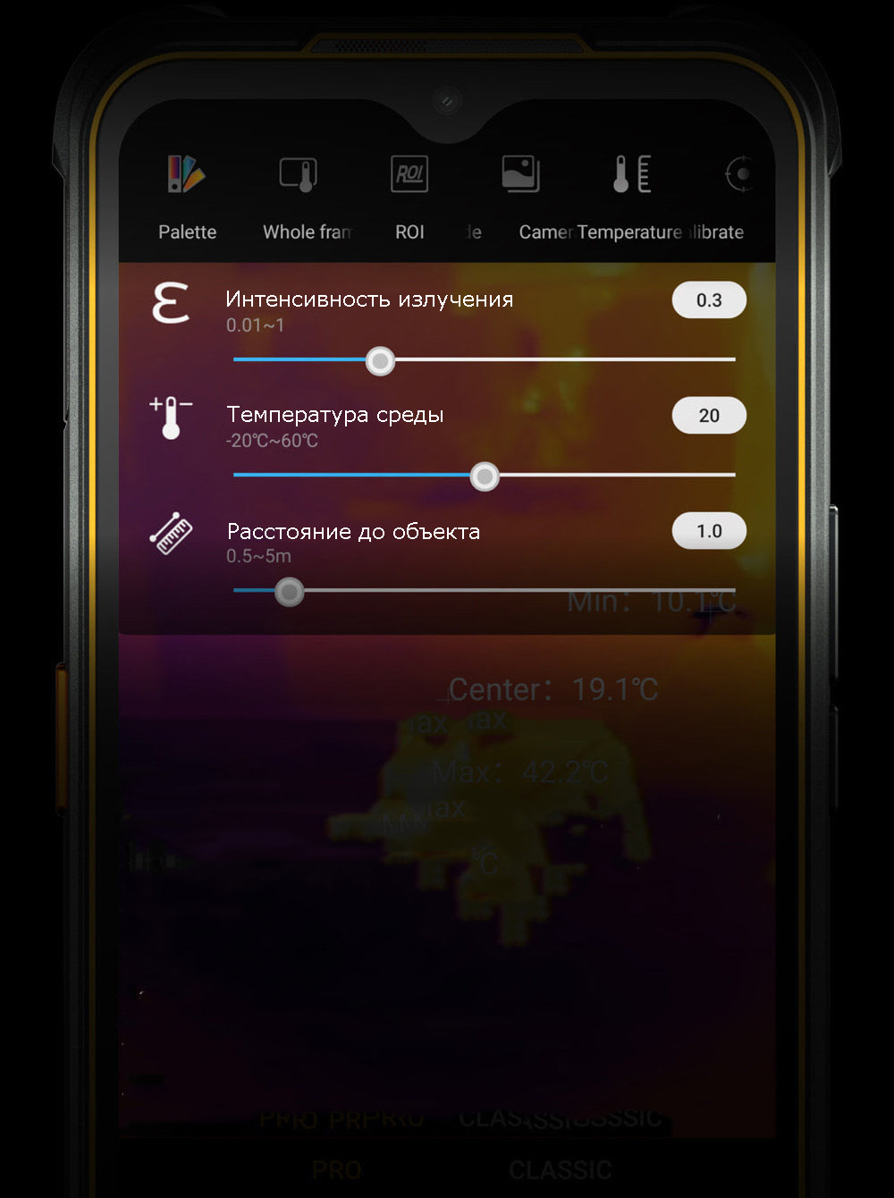 На экране отображается минимальная, средняя и максимальная температура указанной области.